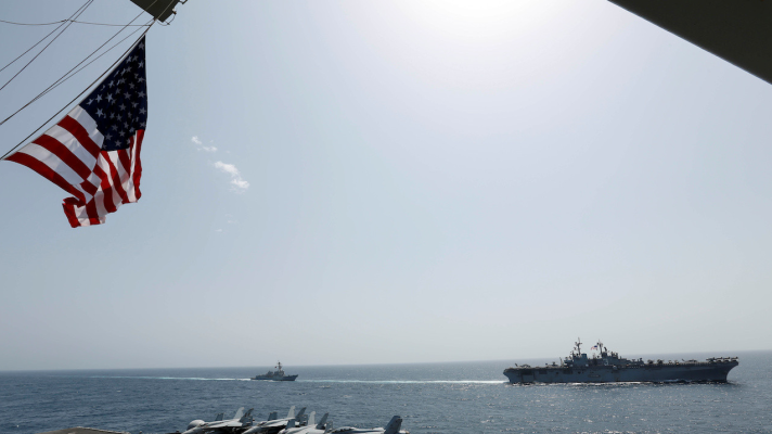 El buque de asalto anfibio clase Wasp de la Armada de los EE.UU., el USS Kearsarge, y el destructor de misiles guiados clase Arleigh Burke, el USS Bainbridge, navegan junto al portaaviones clase Nimitz, el USS Abraham Lincoln (Foto: Michael Singley / Reuters)